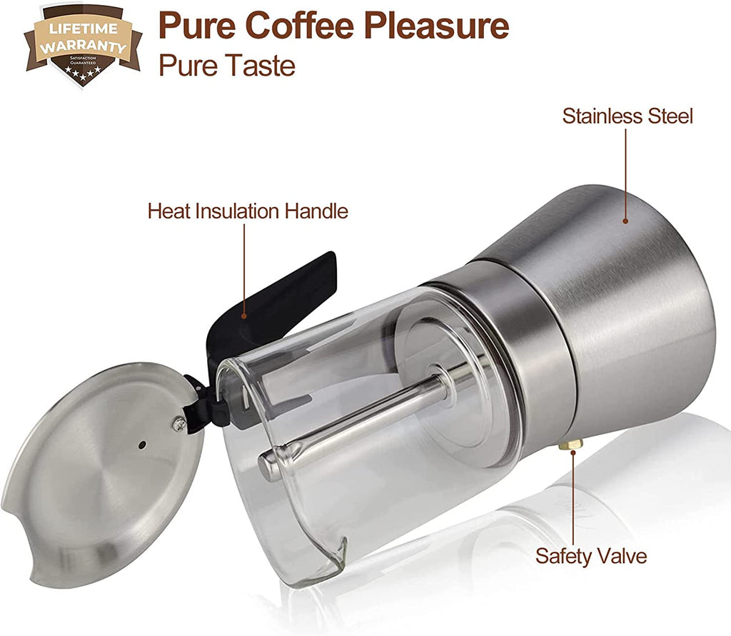 • Attention: We are so confident that you will love our moka pot that we are offering all customers a lifetime satisfaction. If at any point you decide you are not completely satisfied with your purchase, just drop us an email and we will refund 100% of the money.
